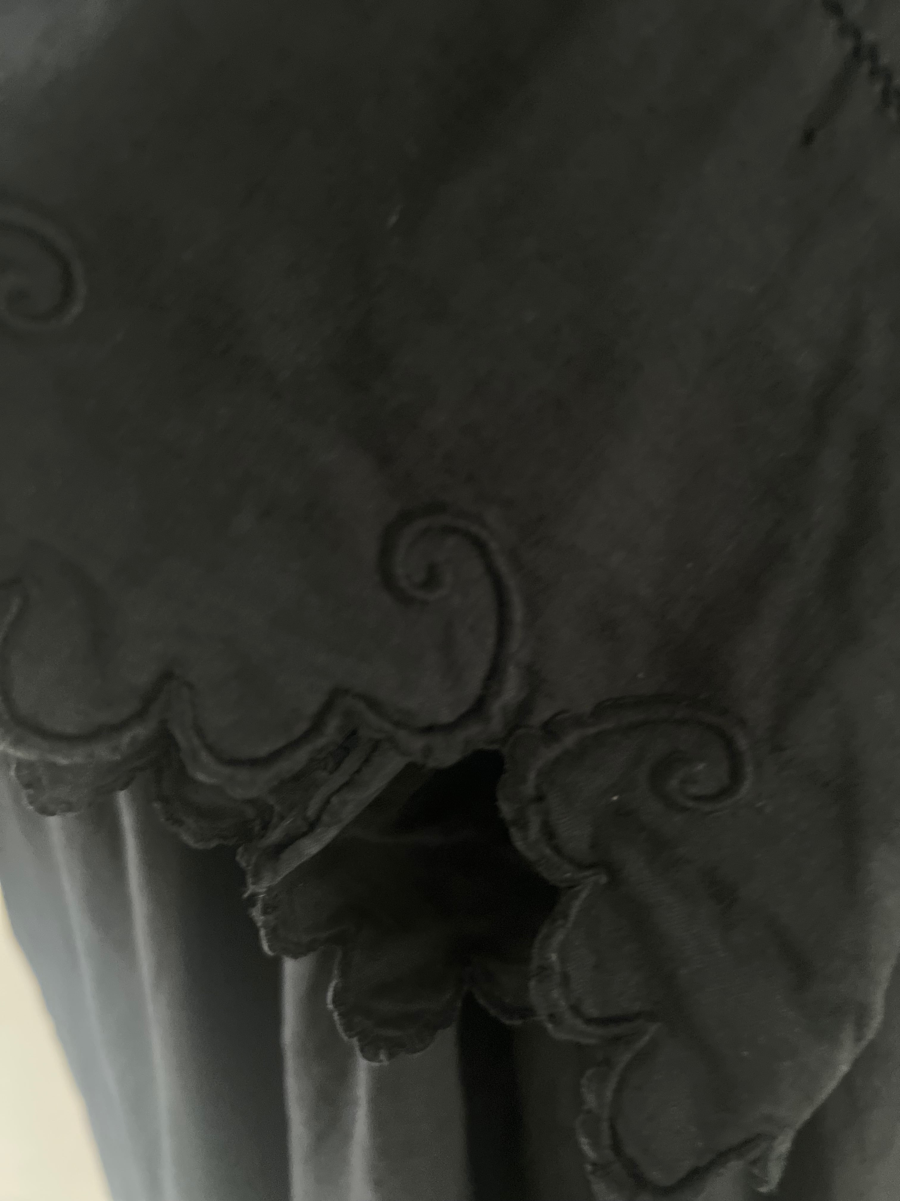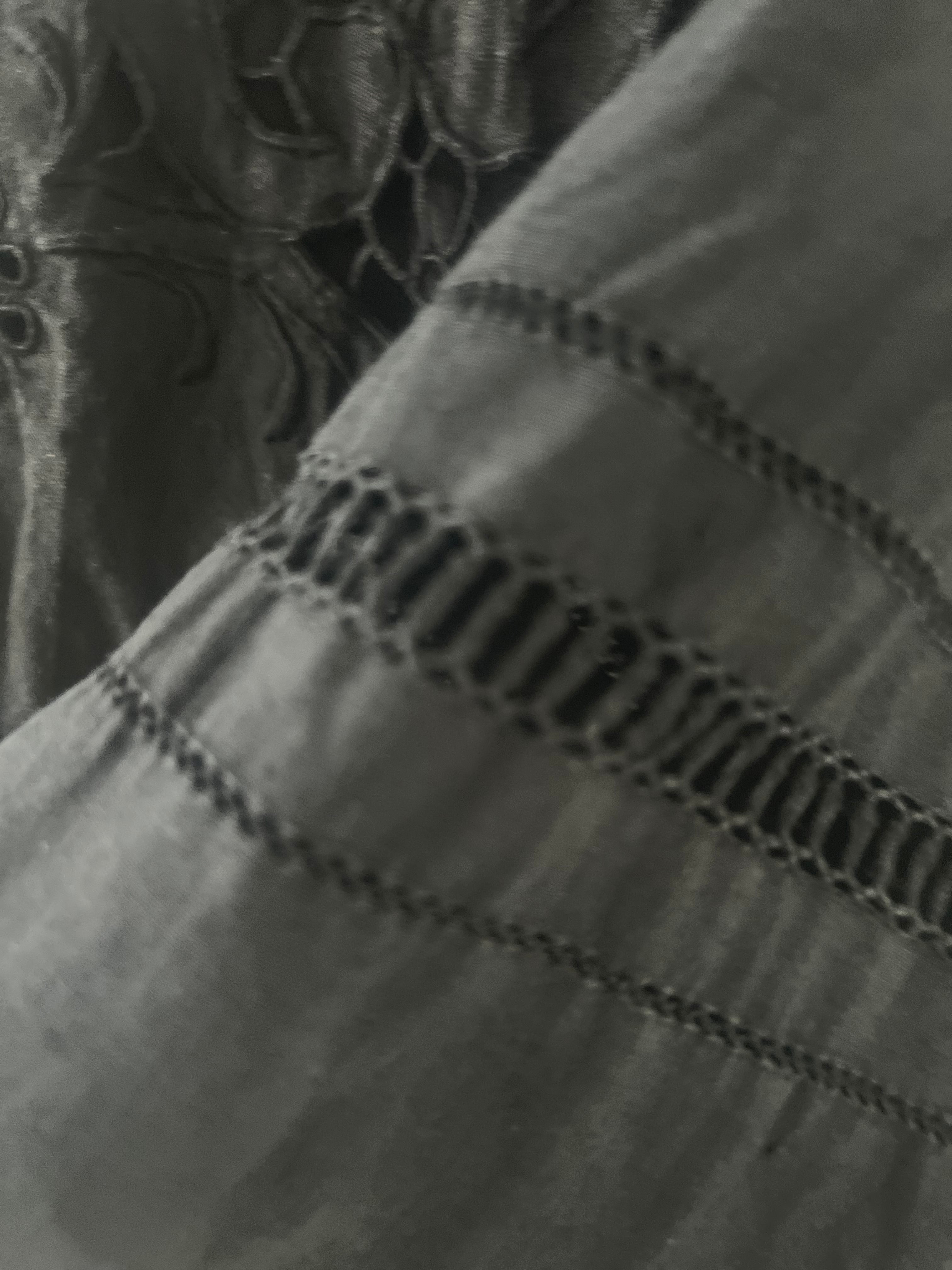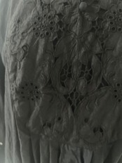 スカラップとドロンワークが施されたお袖はアンティークならでは趣を感じます。ウエストと背中にはふんだんに大きなタックを施しており、アンティーククロス丸ごと一枚使用しています。