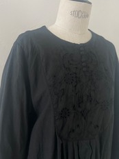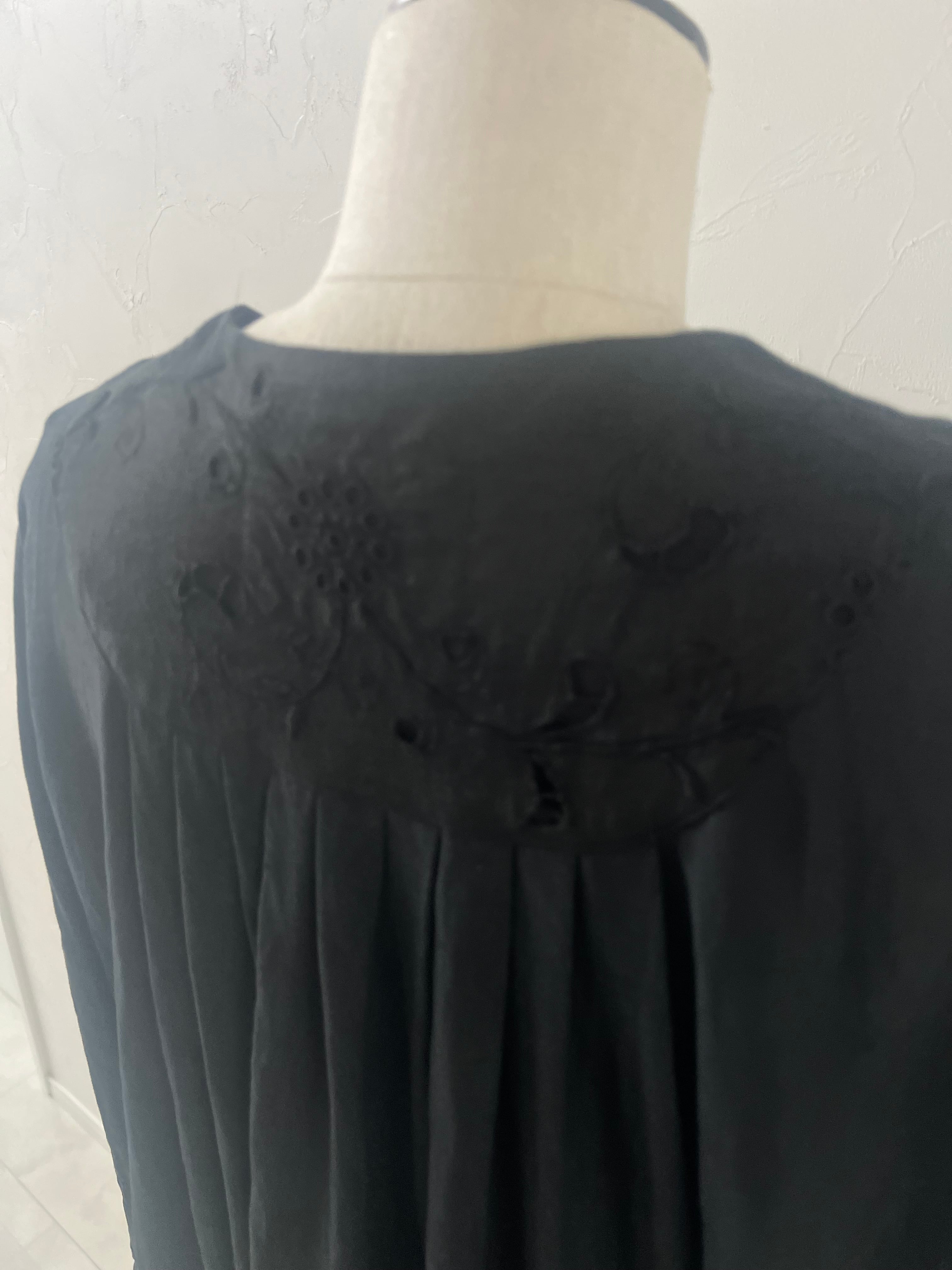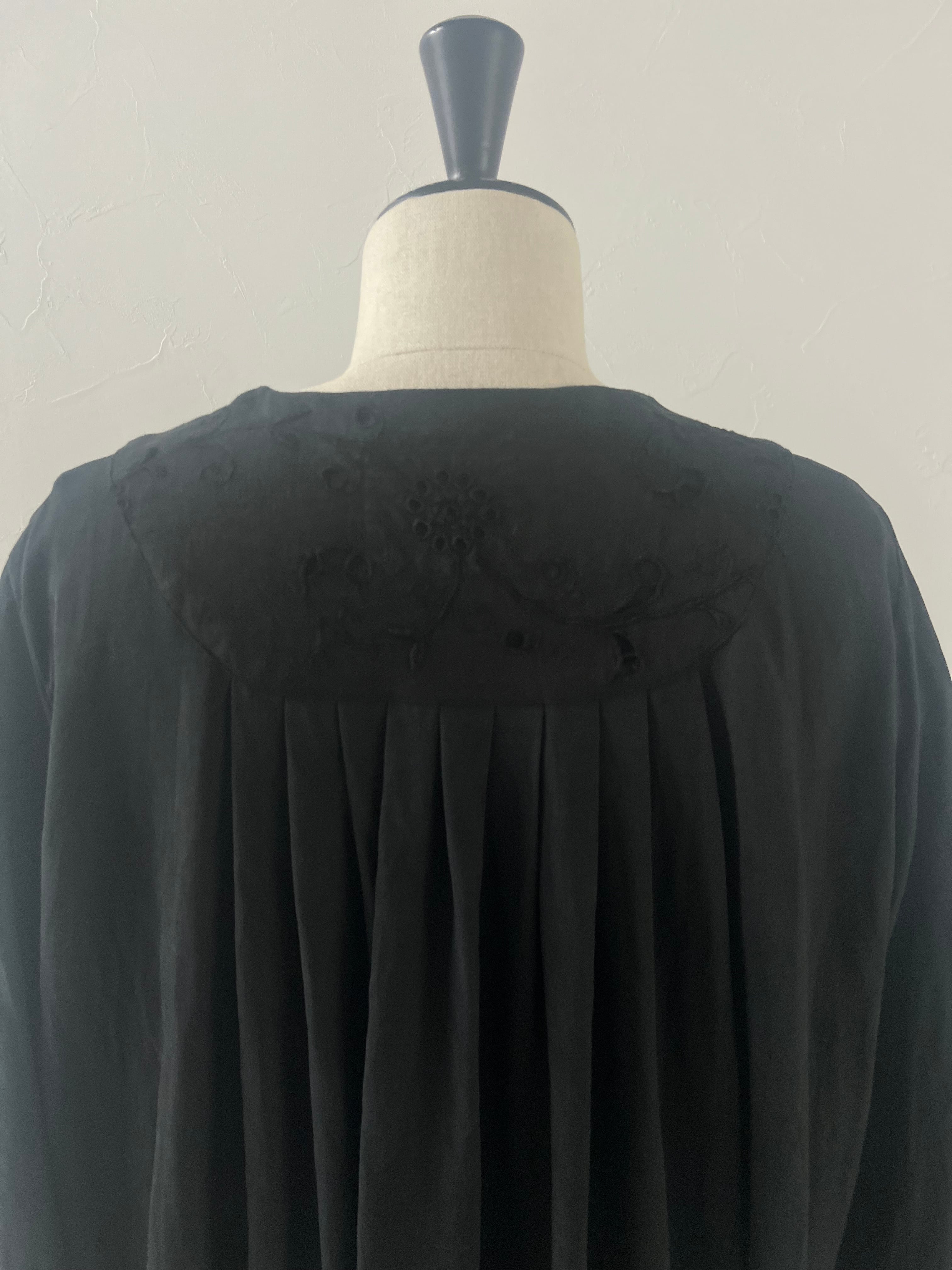 美しいアンティークのcutwork刺繍を手に取って頂きたくてお作りした農父ワンピース。素晴らしいリーフに中に咲いているようなお花の刺繍を胸元と後ろヨークに使用しています。