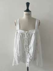 針と糸で模様をかがりながら作り上げていく、立体的で繊細な技法が詰まった伝統的なバテンレースと上質なリネンを使用し、キャミソールを仕立てました。