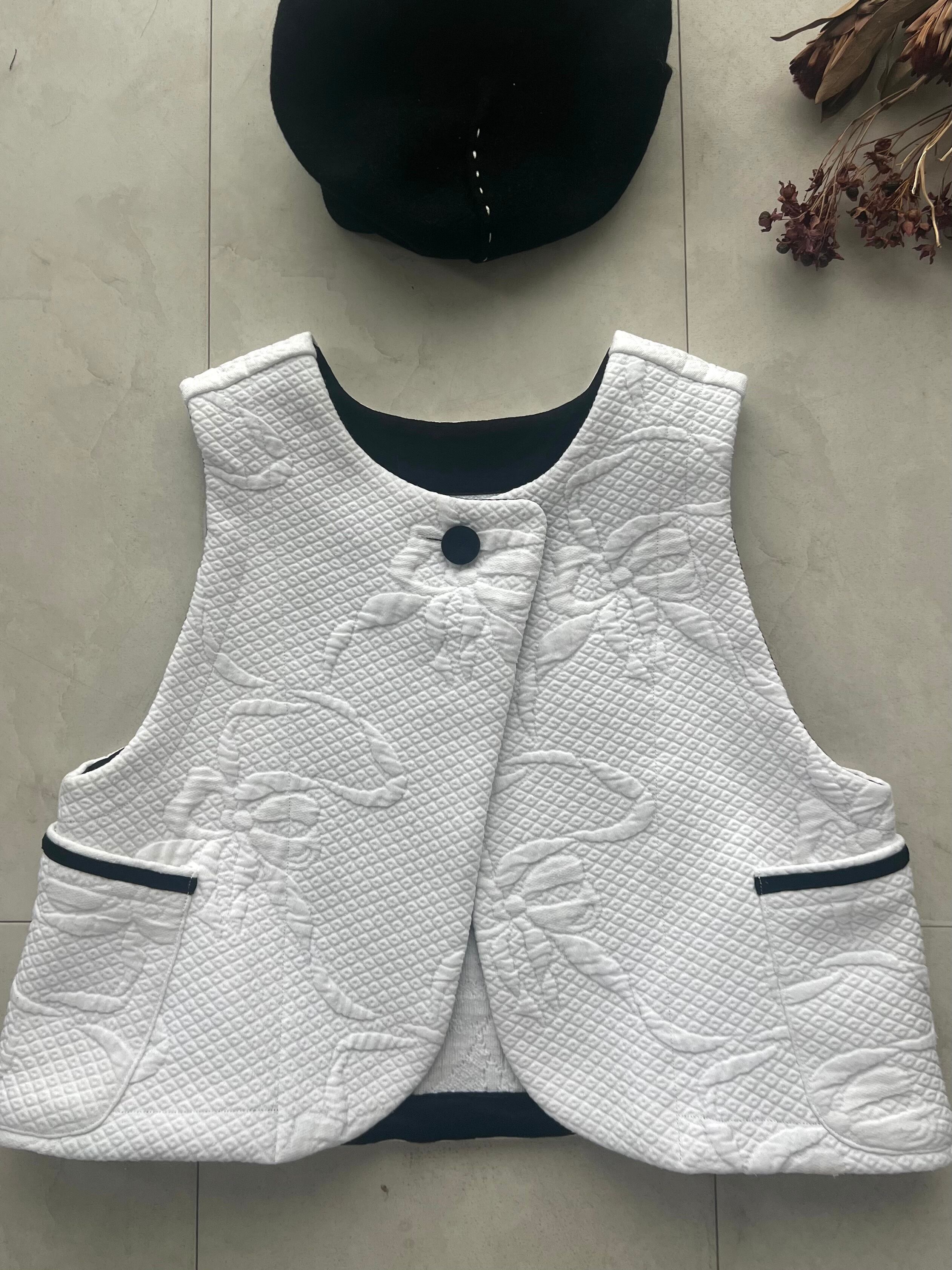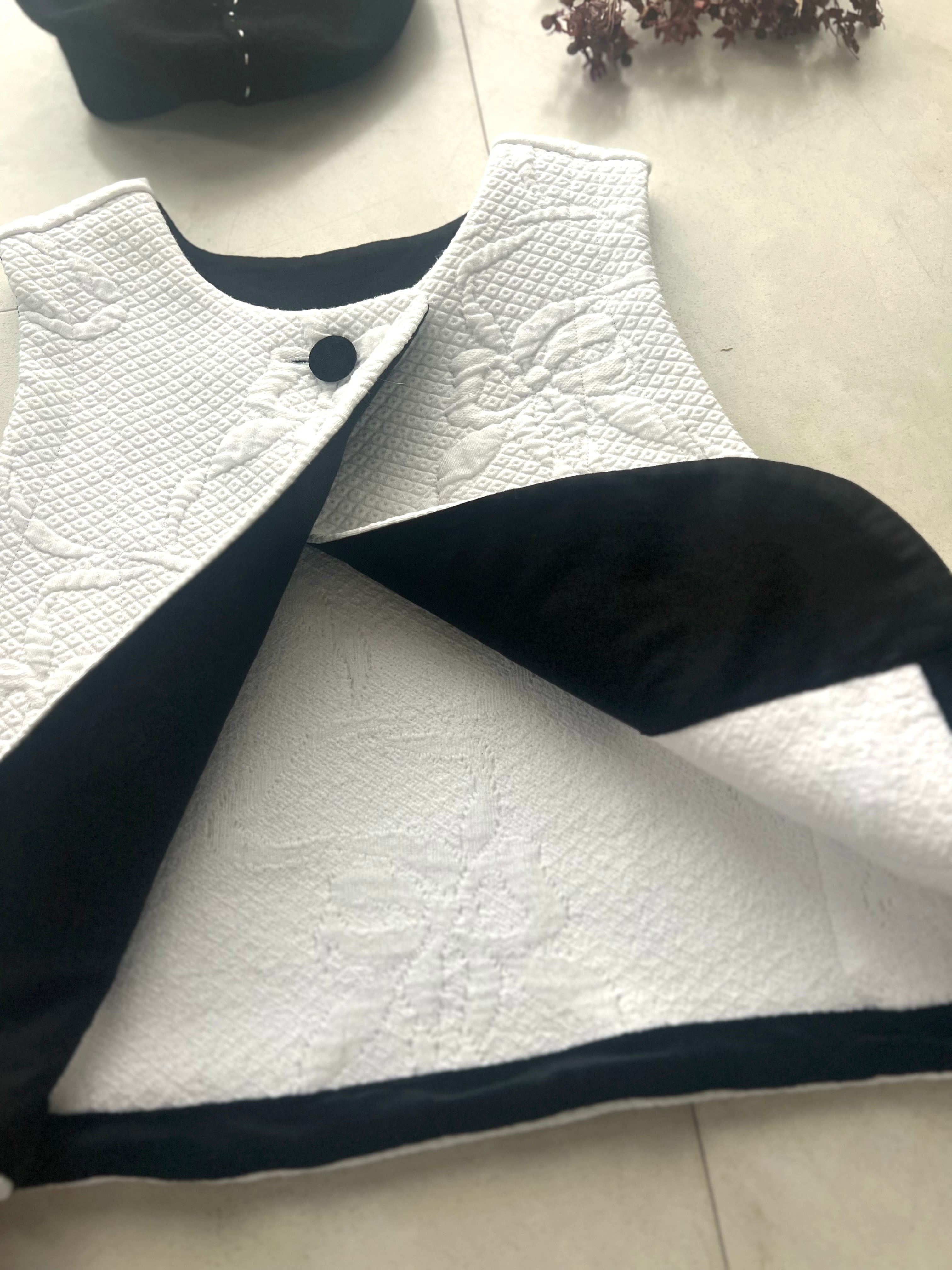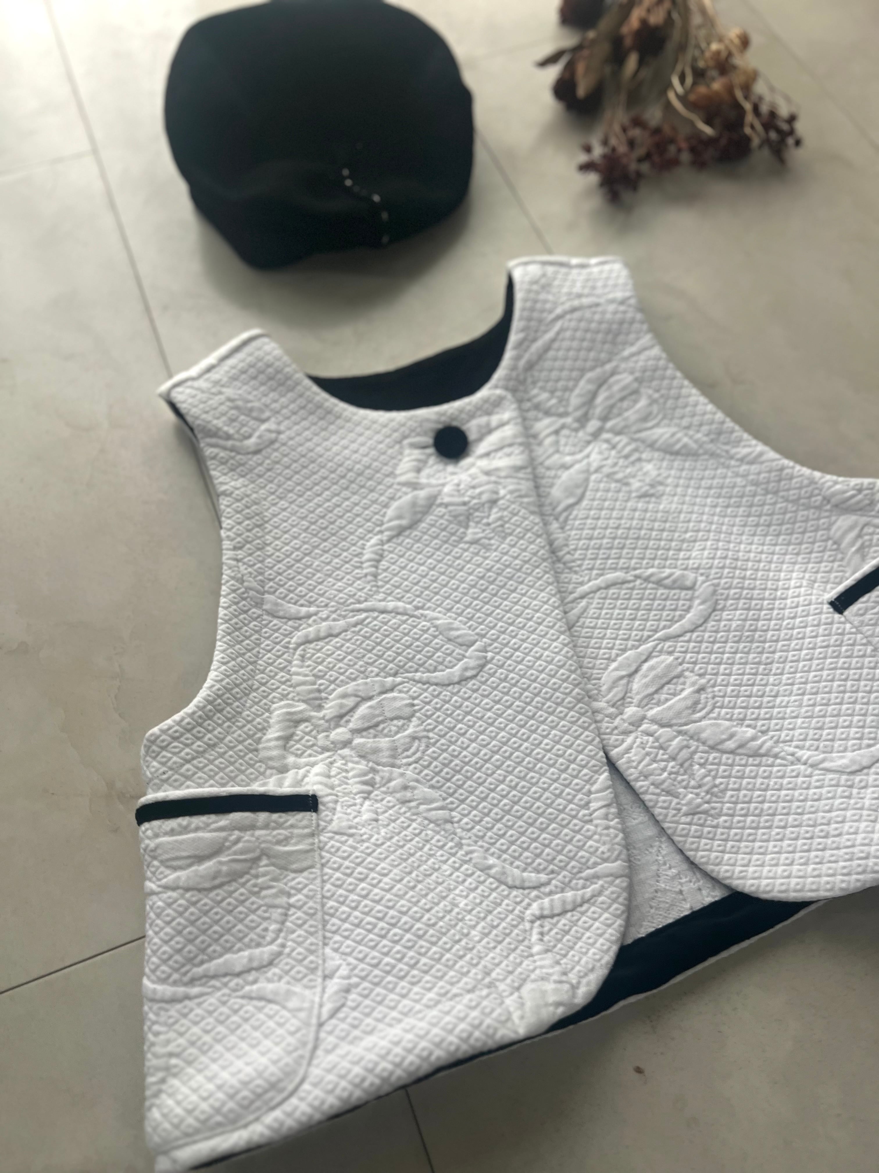 とても珍しいリボン模様のピケを使用し、着回しの効くベストを作りました。裏のヨークには黒地を合わせ、裏のヨークには黒地を合わせて、甘さを少しだけ引き締めています。袖口と裾からちらりと見えるベルベットが、大人っぽいポイントです。
