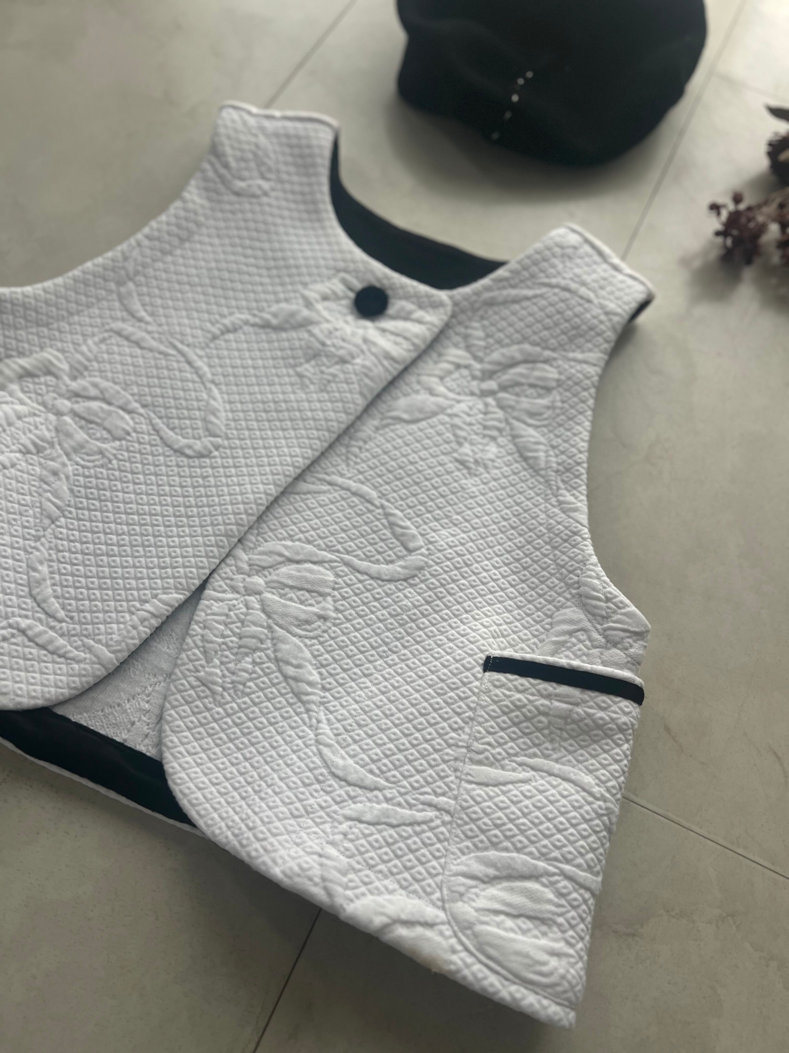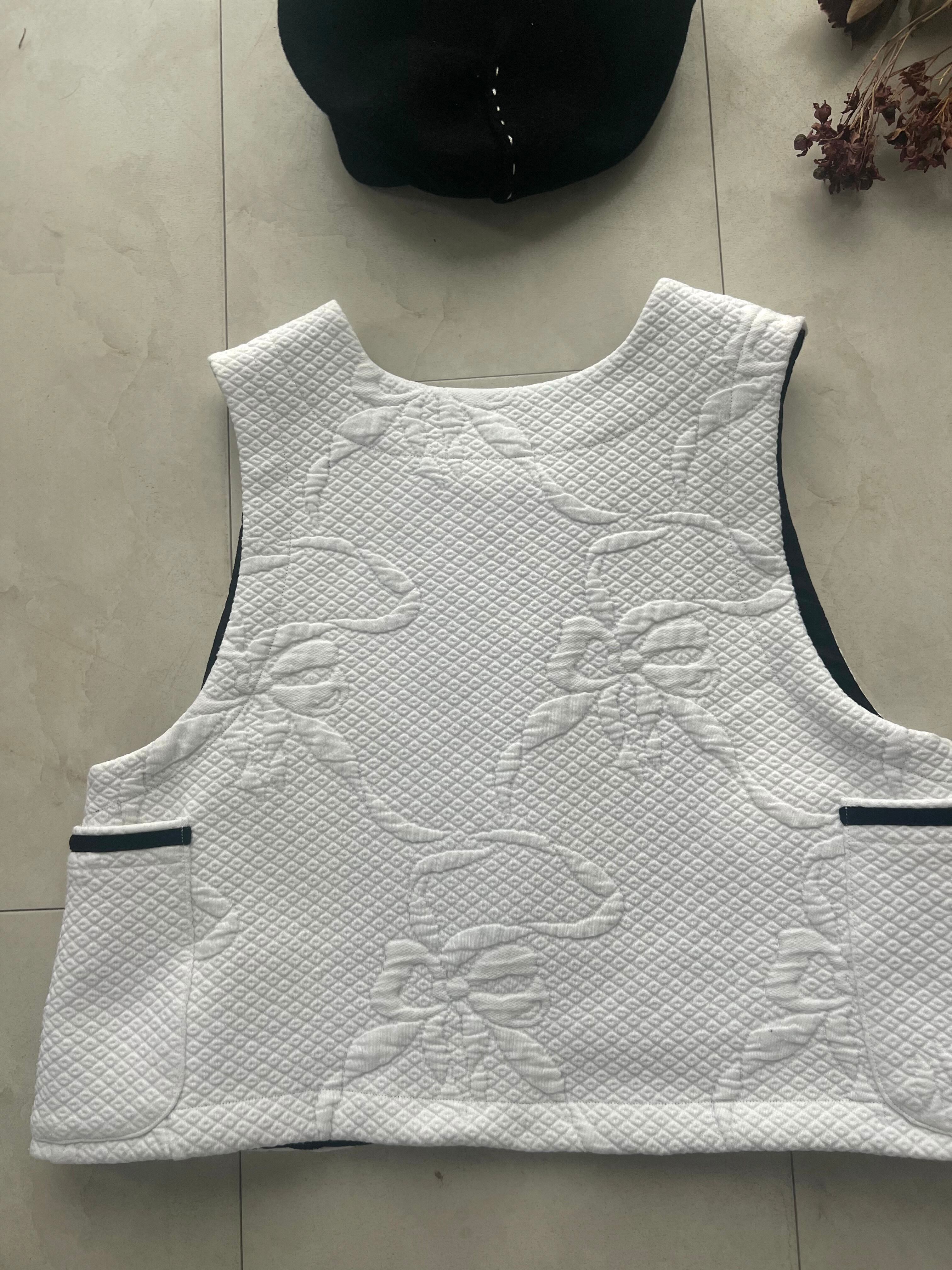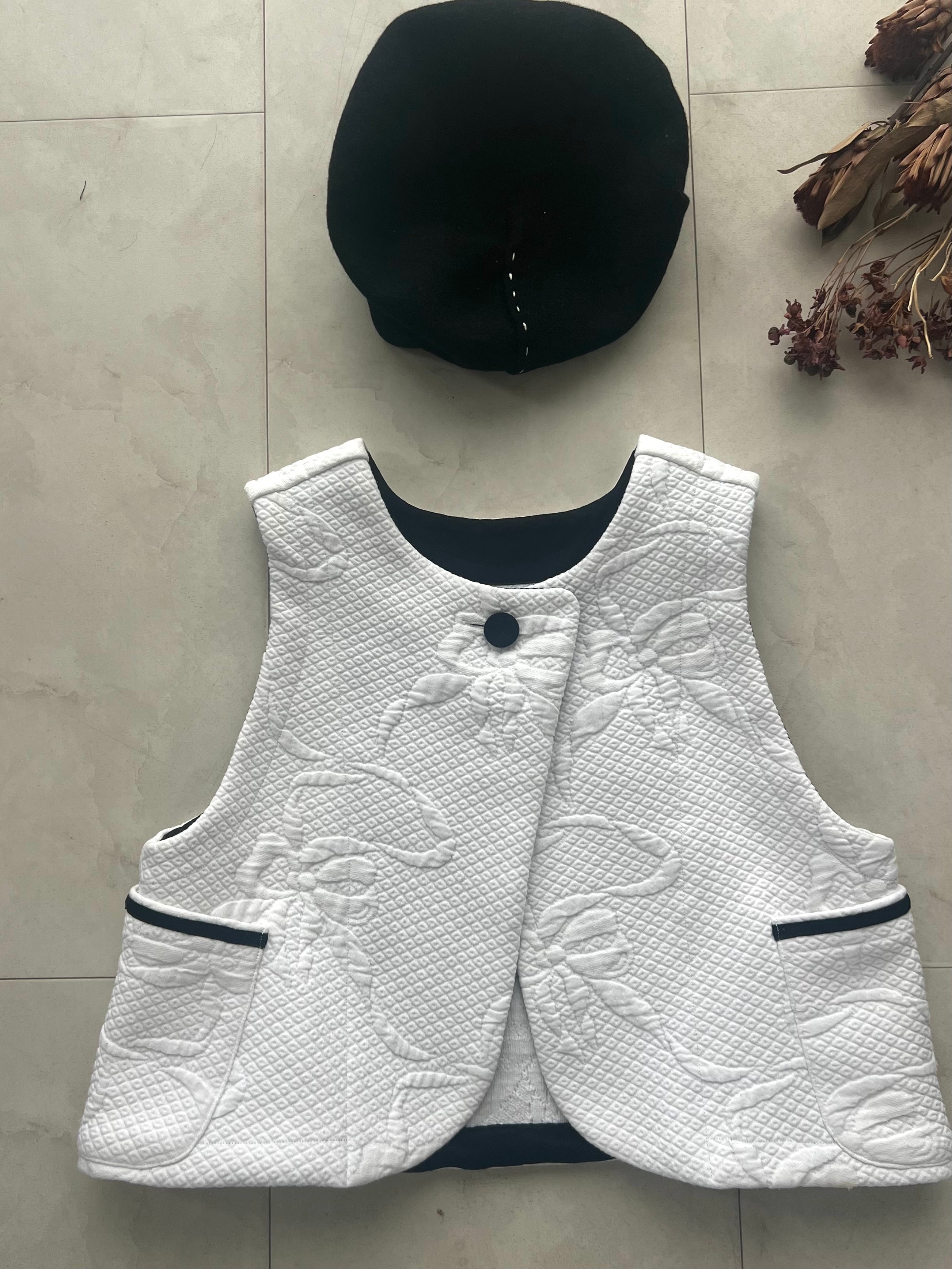 とても珍しいリボン模様のピケを使用し、着回しの効くベストを作りました。裏のヨークには黒地を合わせ、裏のヨークには黒地を合わせて、甘さを少しだけ引き締めています。袖口と裾からちらりと見えるベルベットが、大人っぽいポイントです。