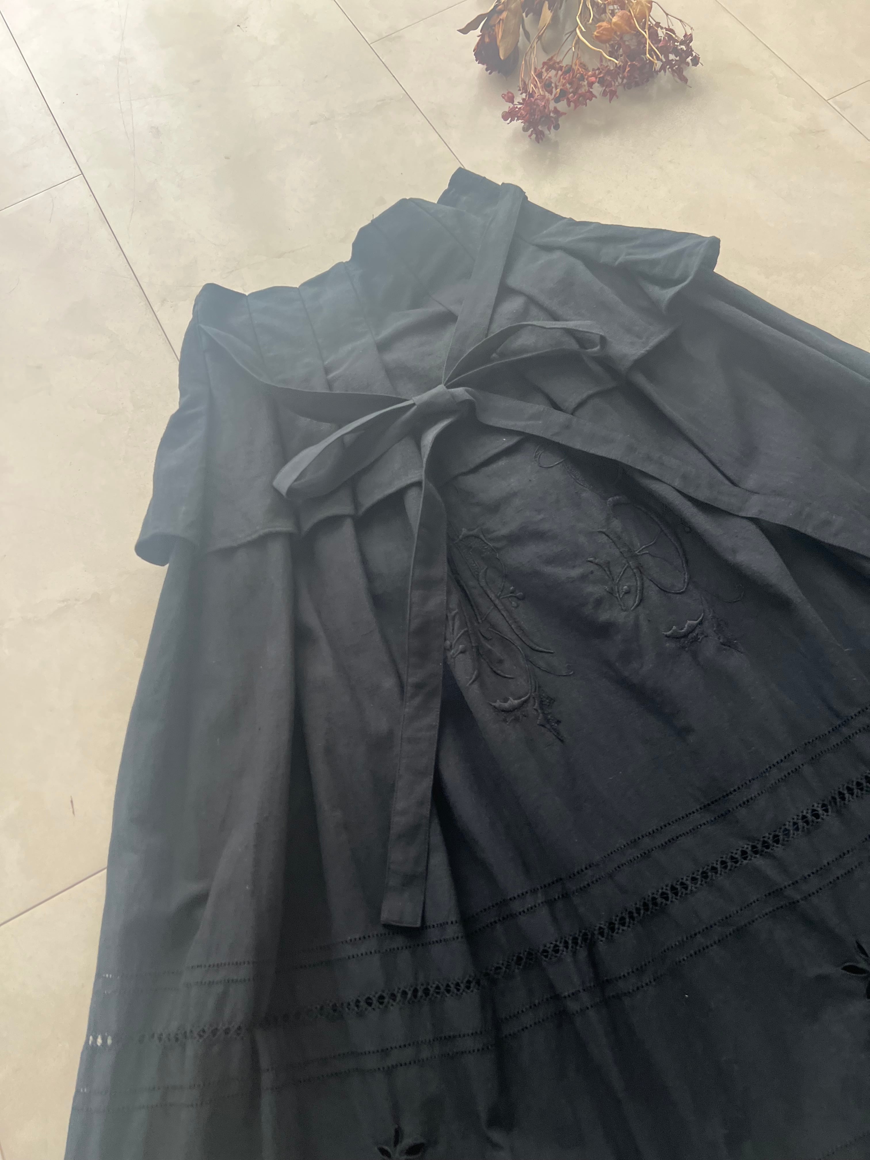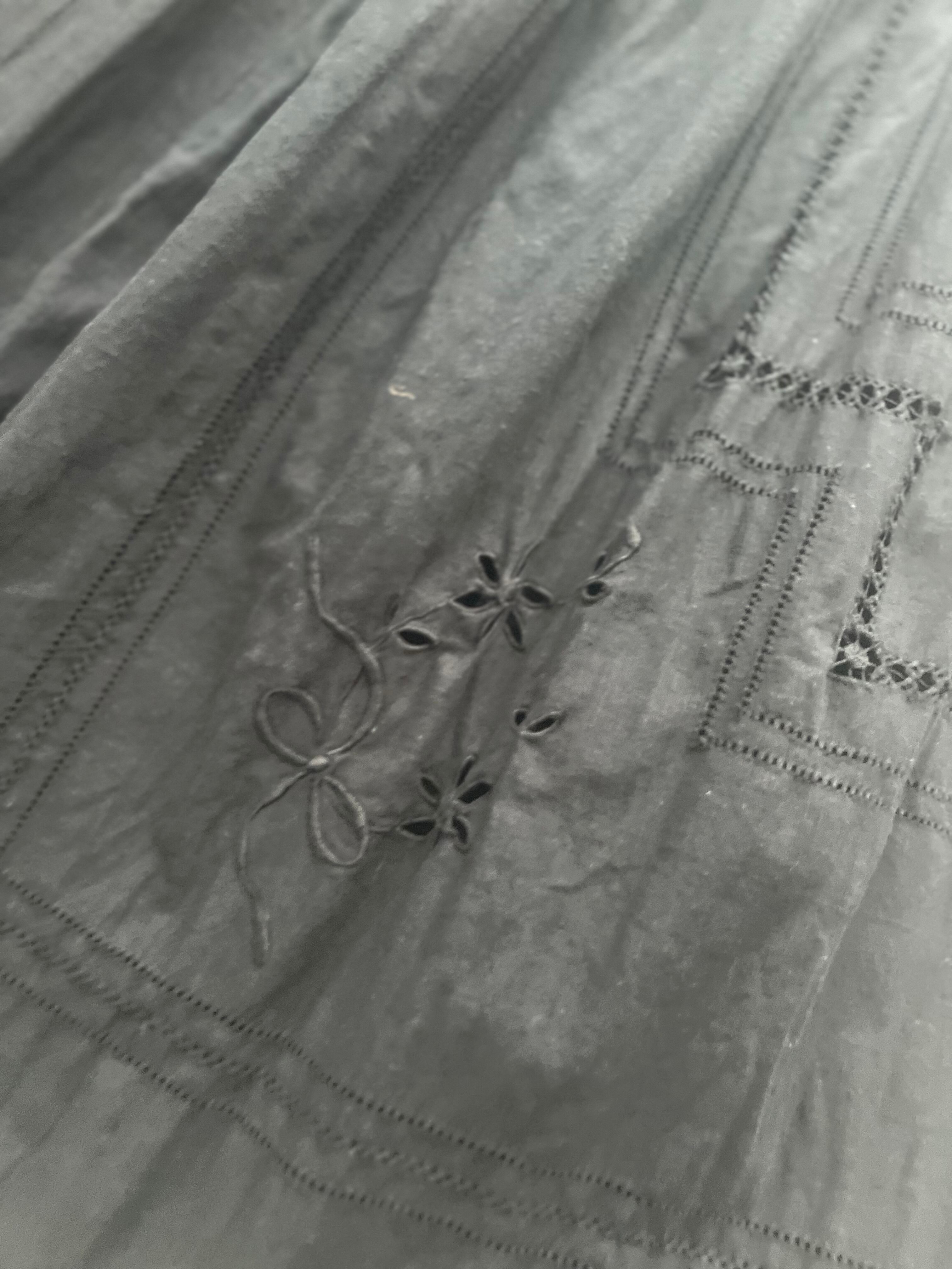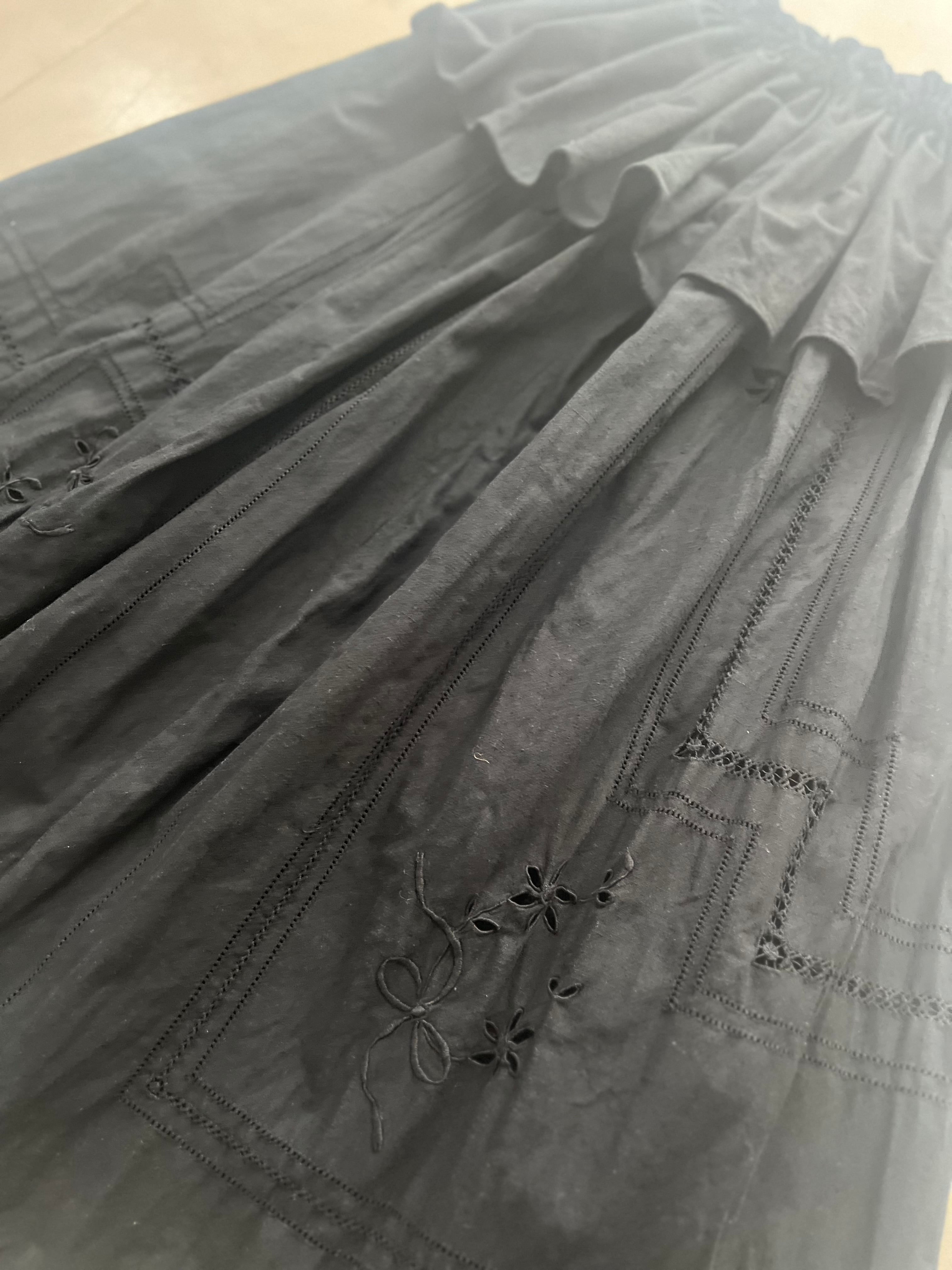 モノグラム「MS」とドロンワーク、cutworkが施された、黒く染め上げたアンティーククロスを使用し、2段仕立てのスカートをお作りしました。