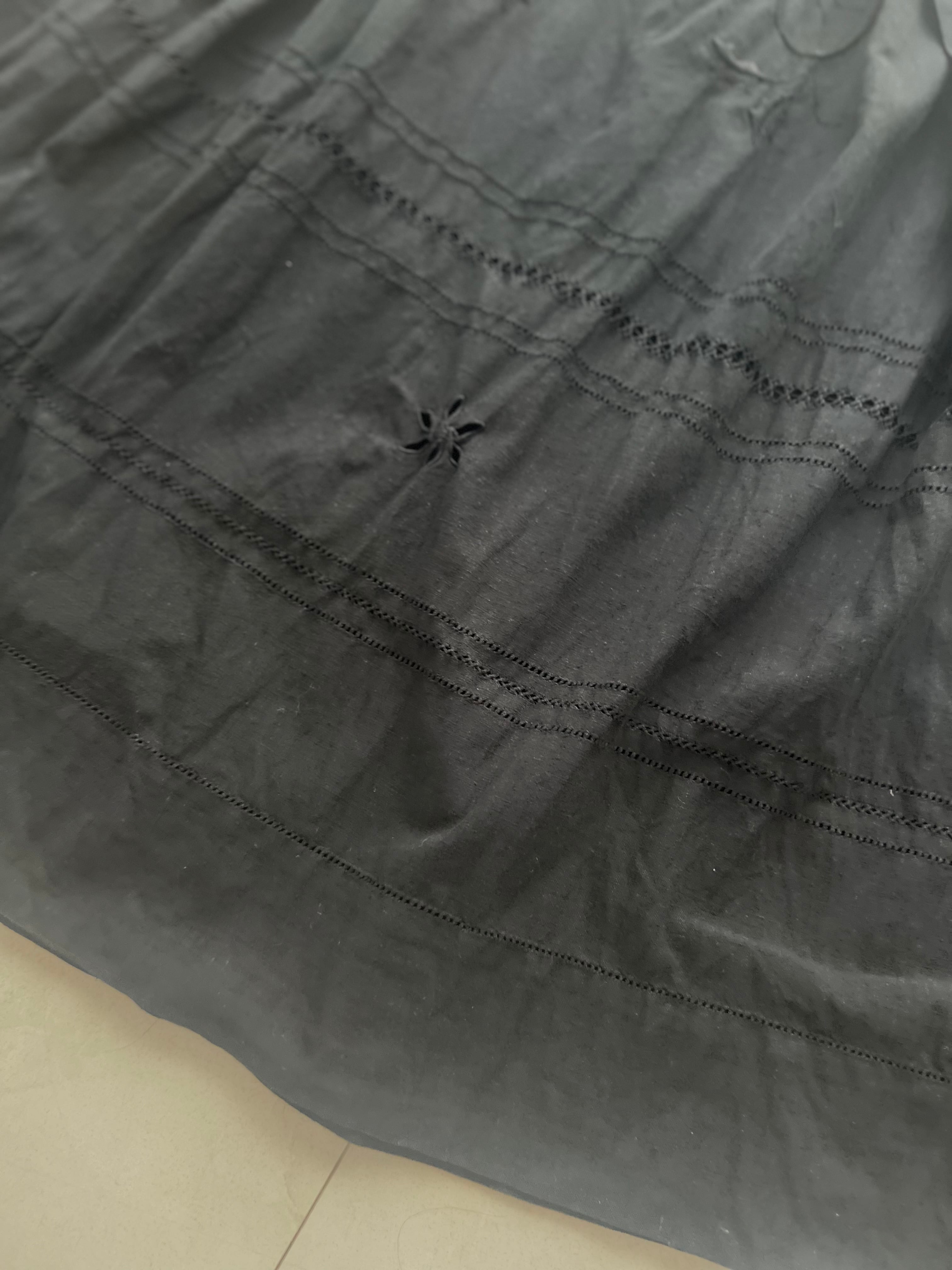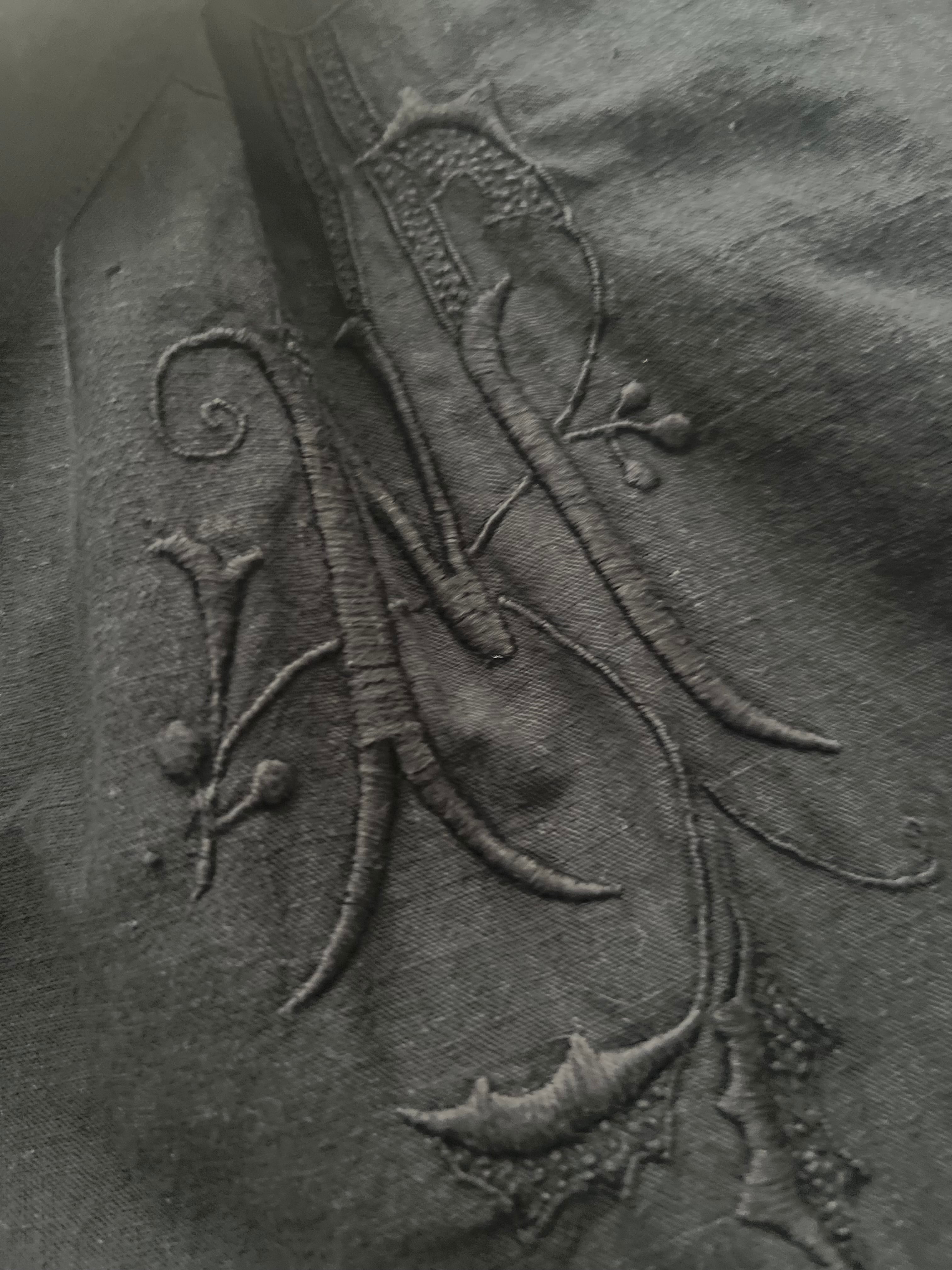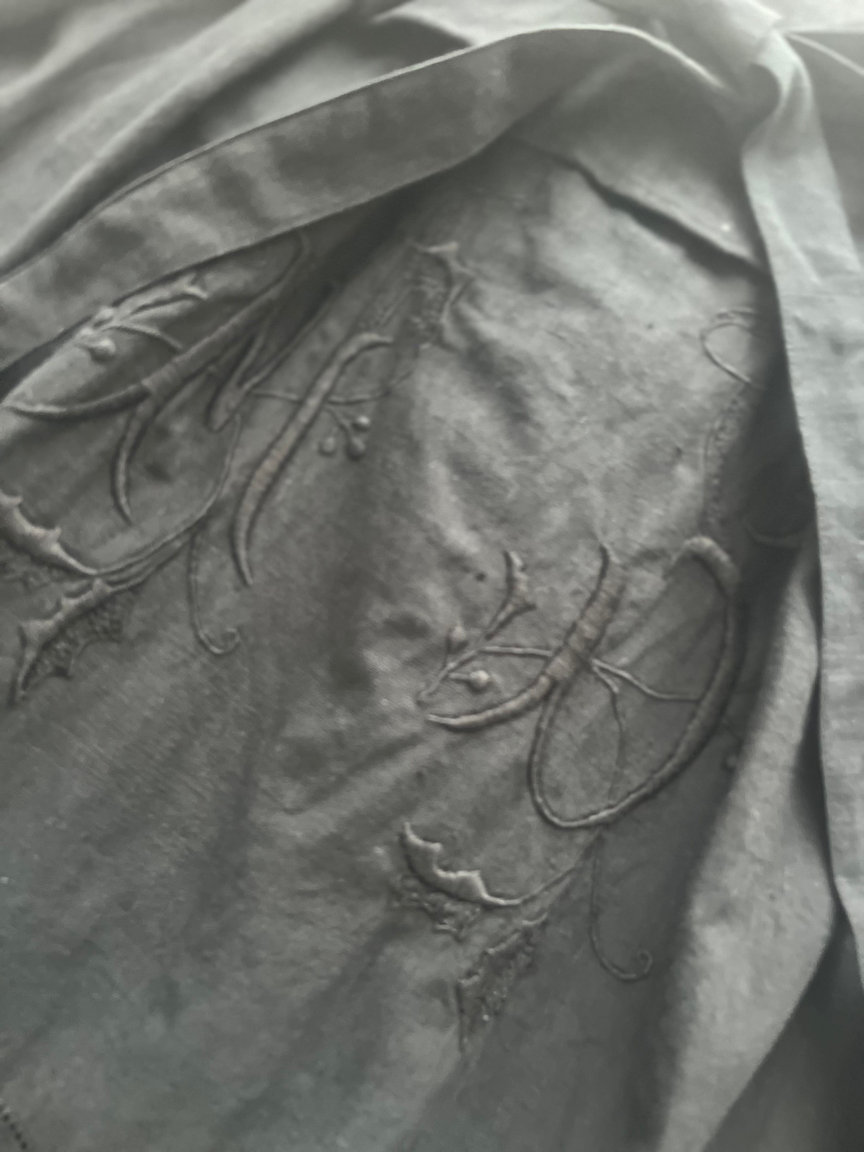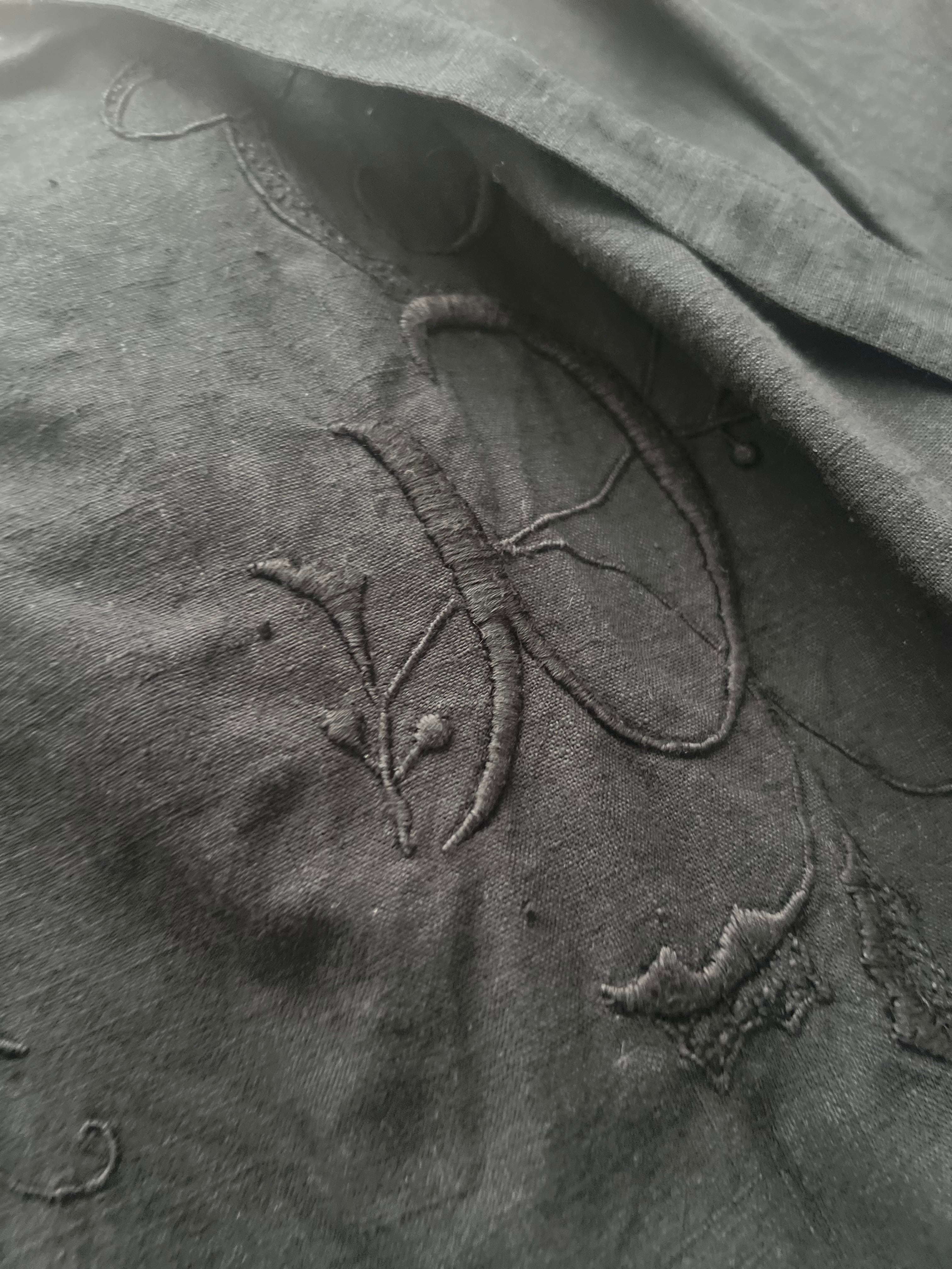 モノグラム「MS」とドロンワーク、cutworkが施された、黒く染め上げたアンティーククロスを使用し、2段仕立てのスカートをお作りしました。
