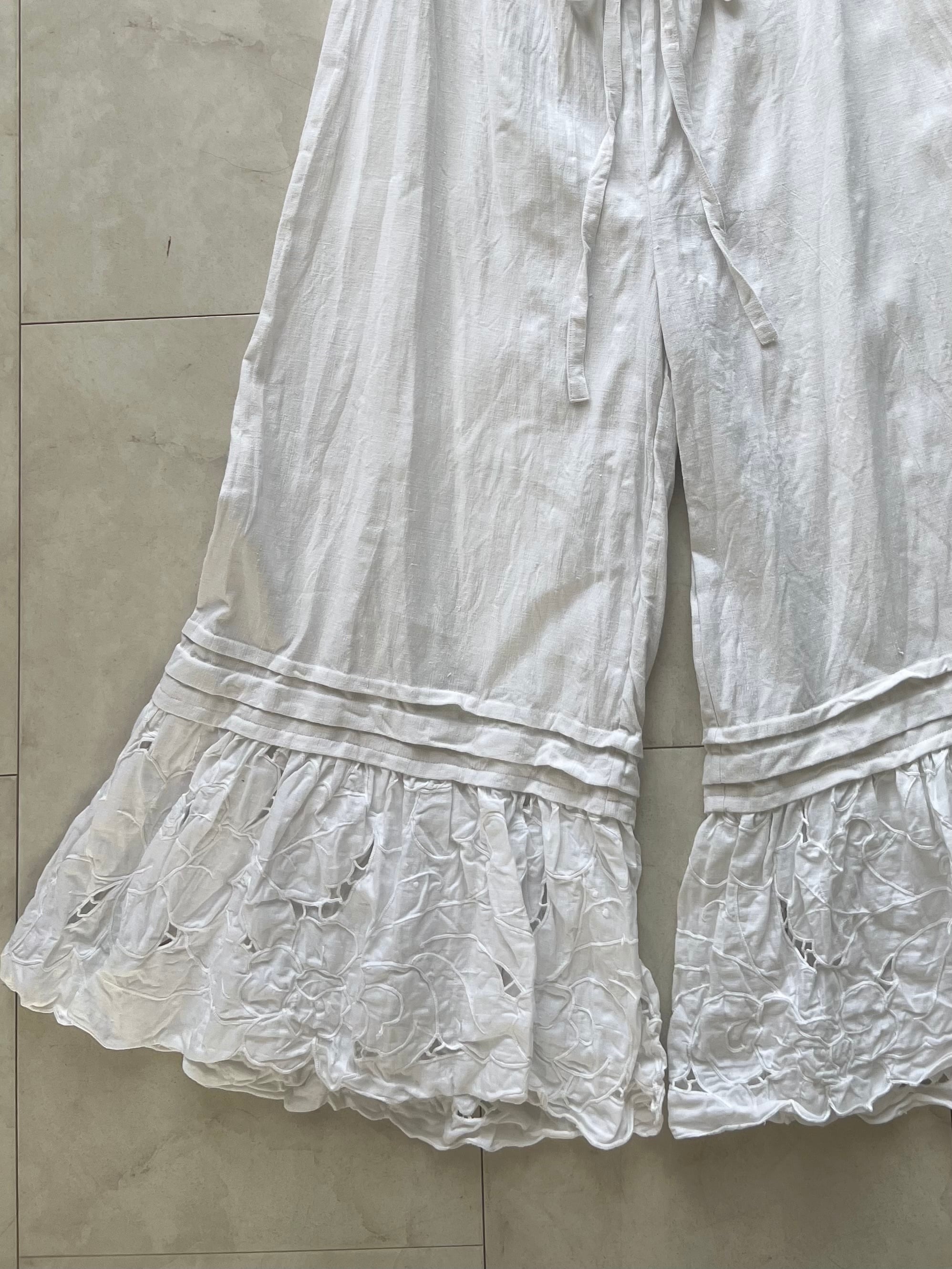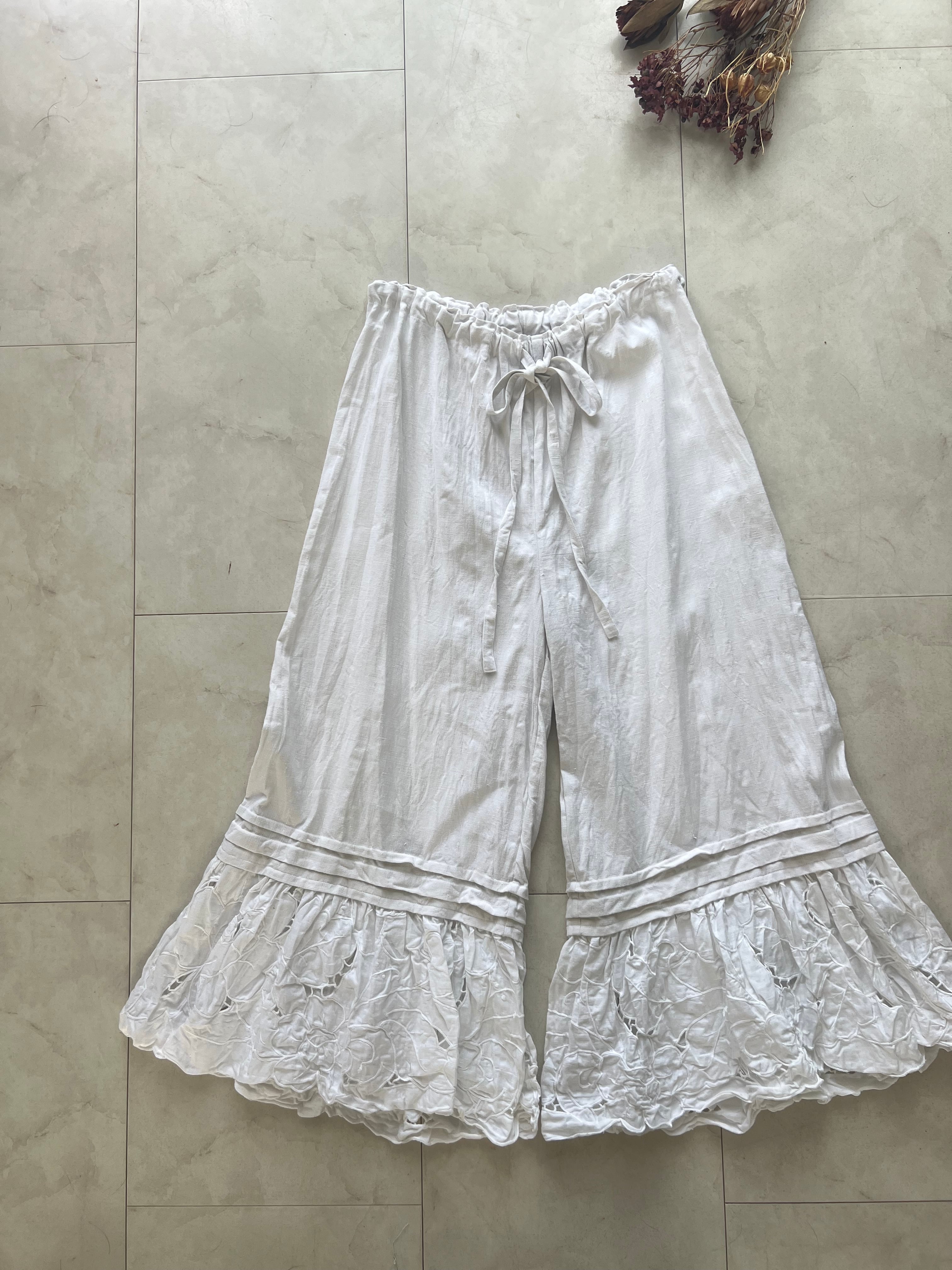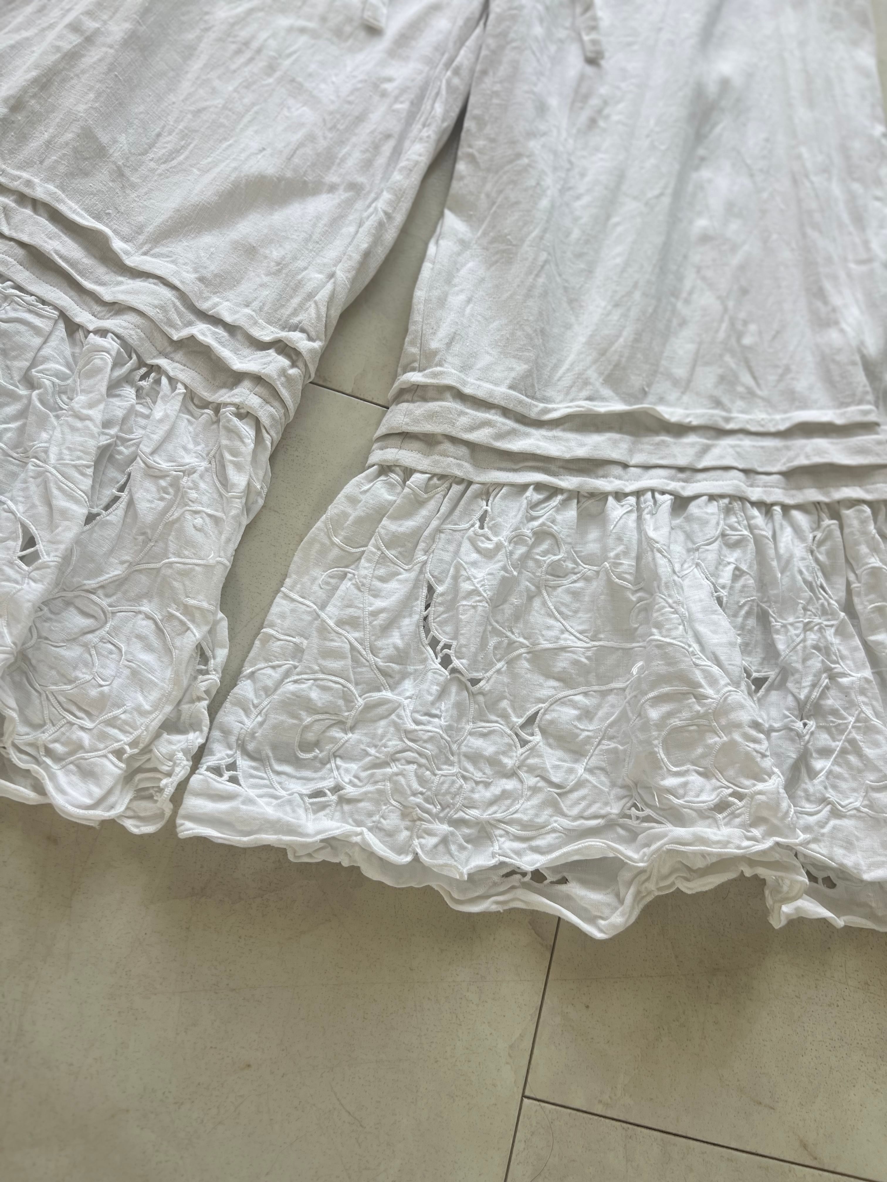 アンティークリネンとcutworkレースのピンタックパンツ