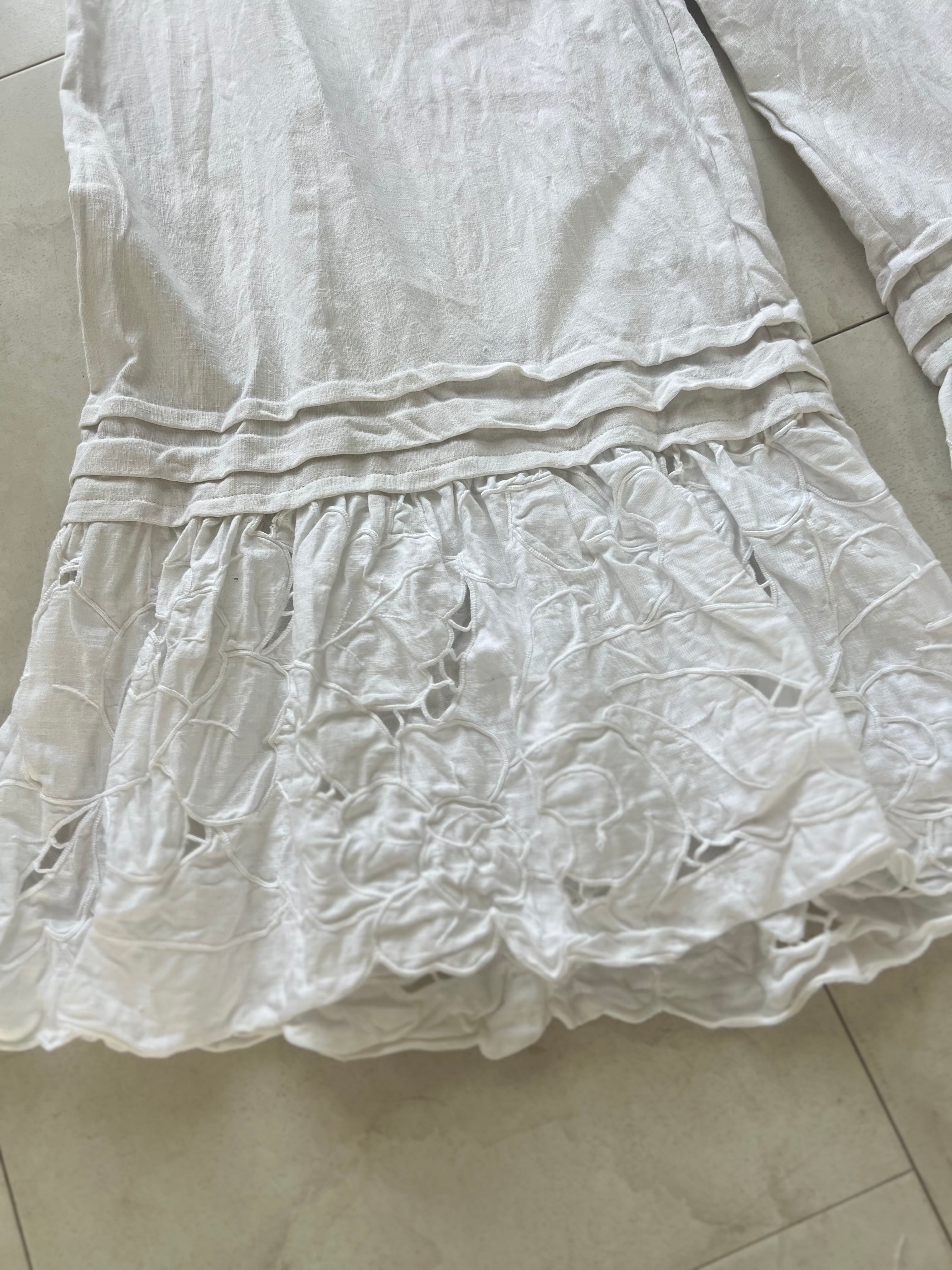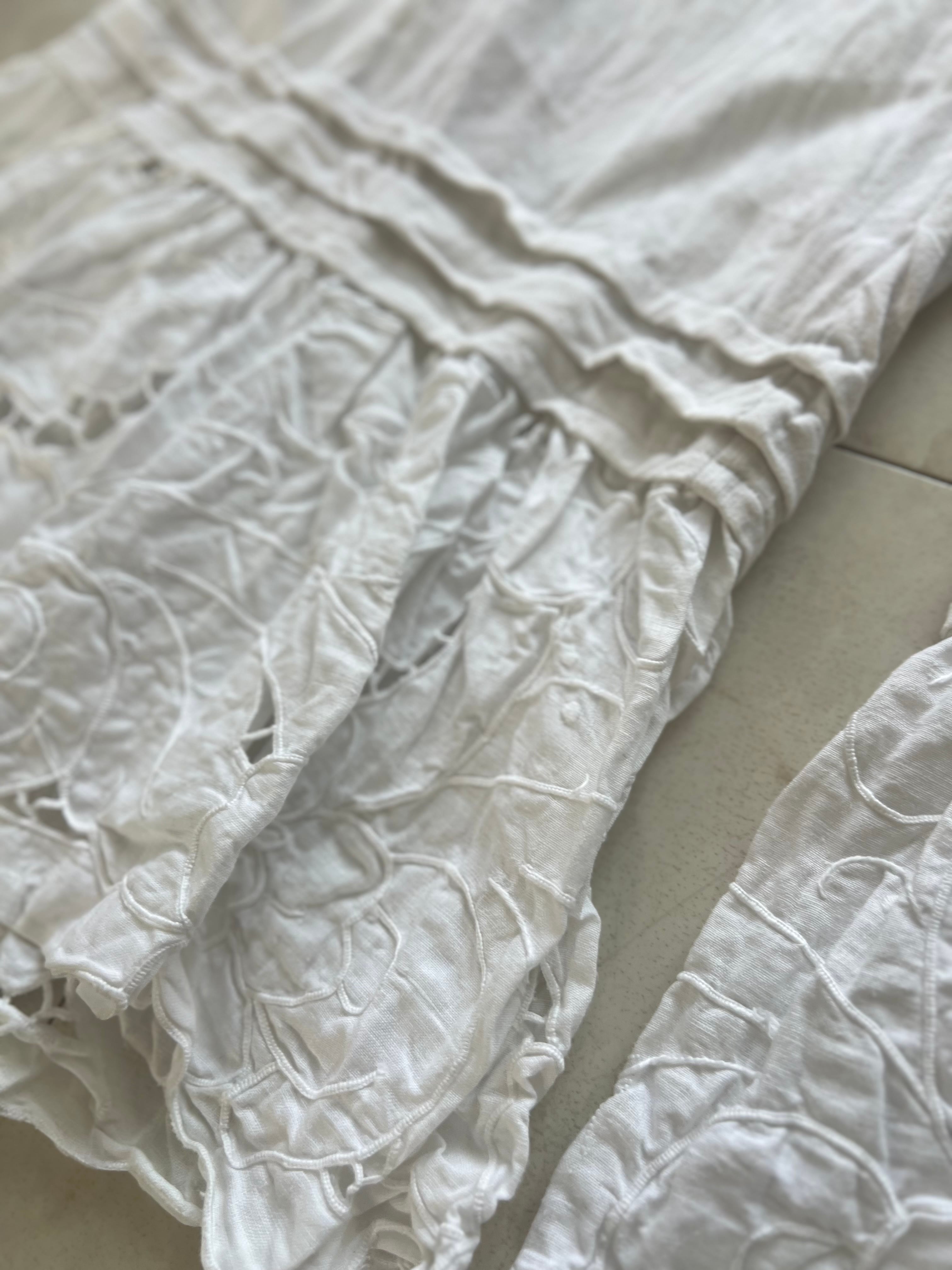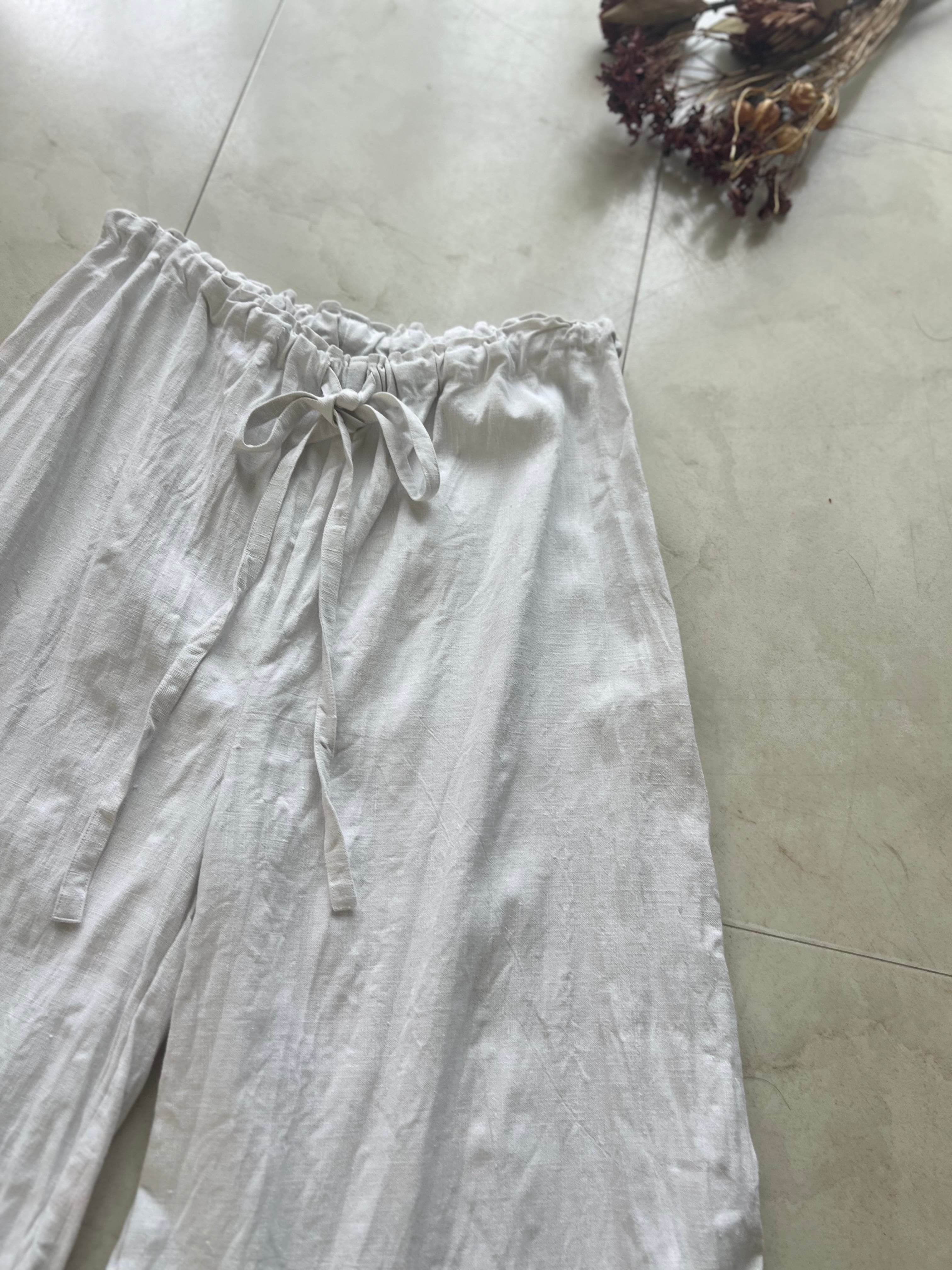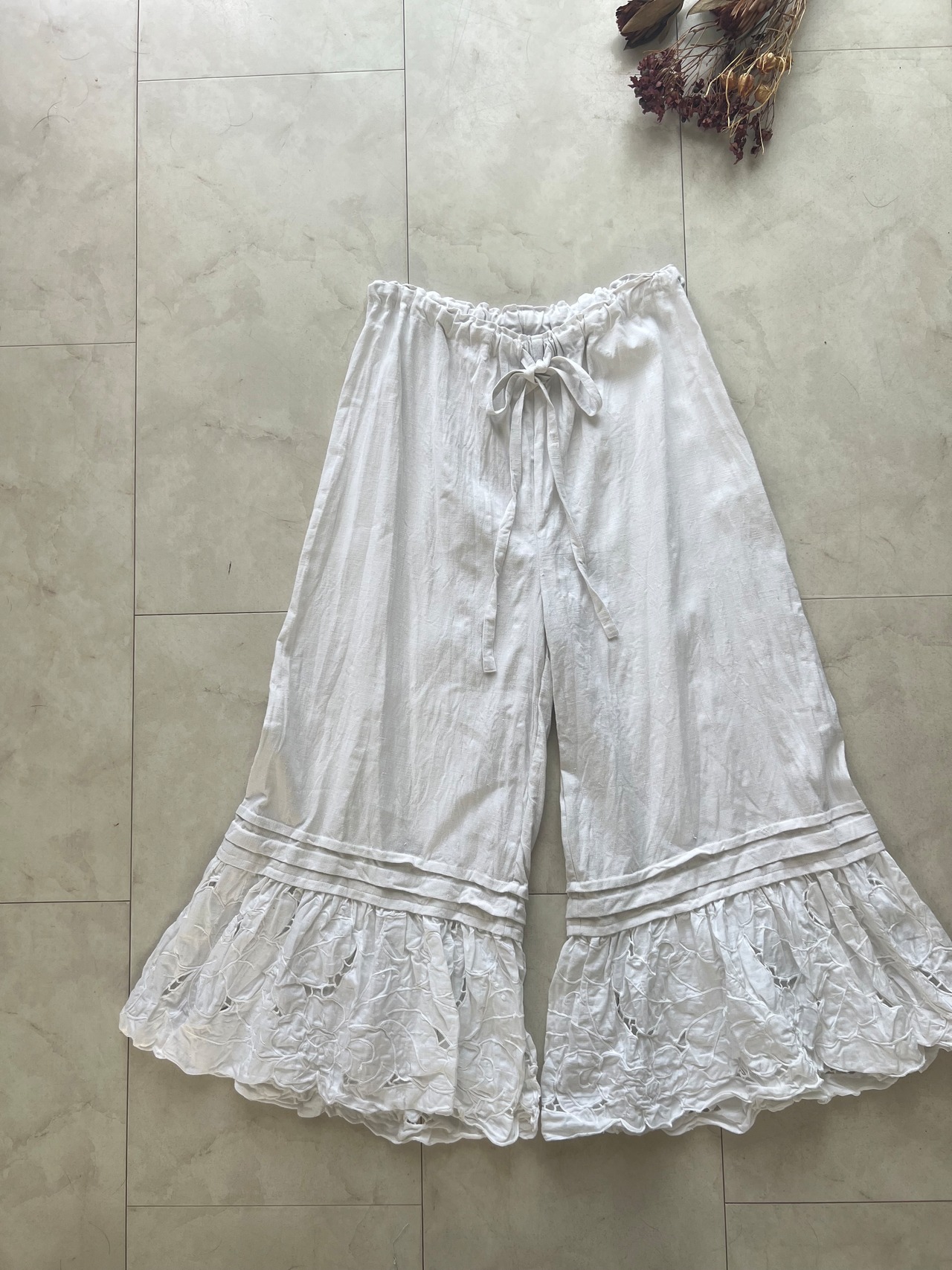 アンティークリネンとcutworkレースのピンタックパンツ